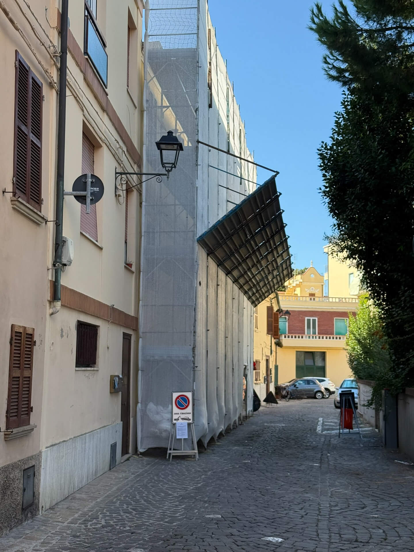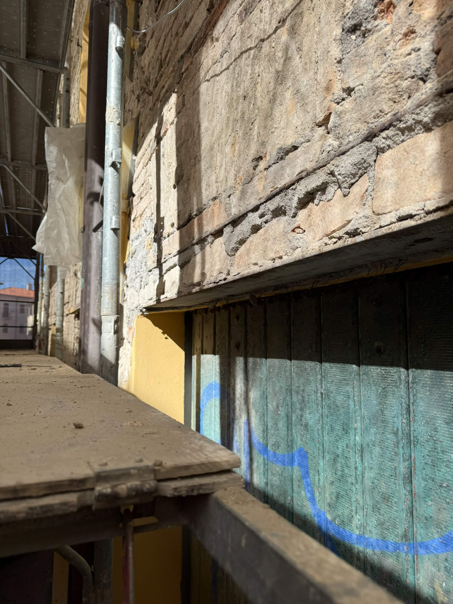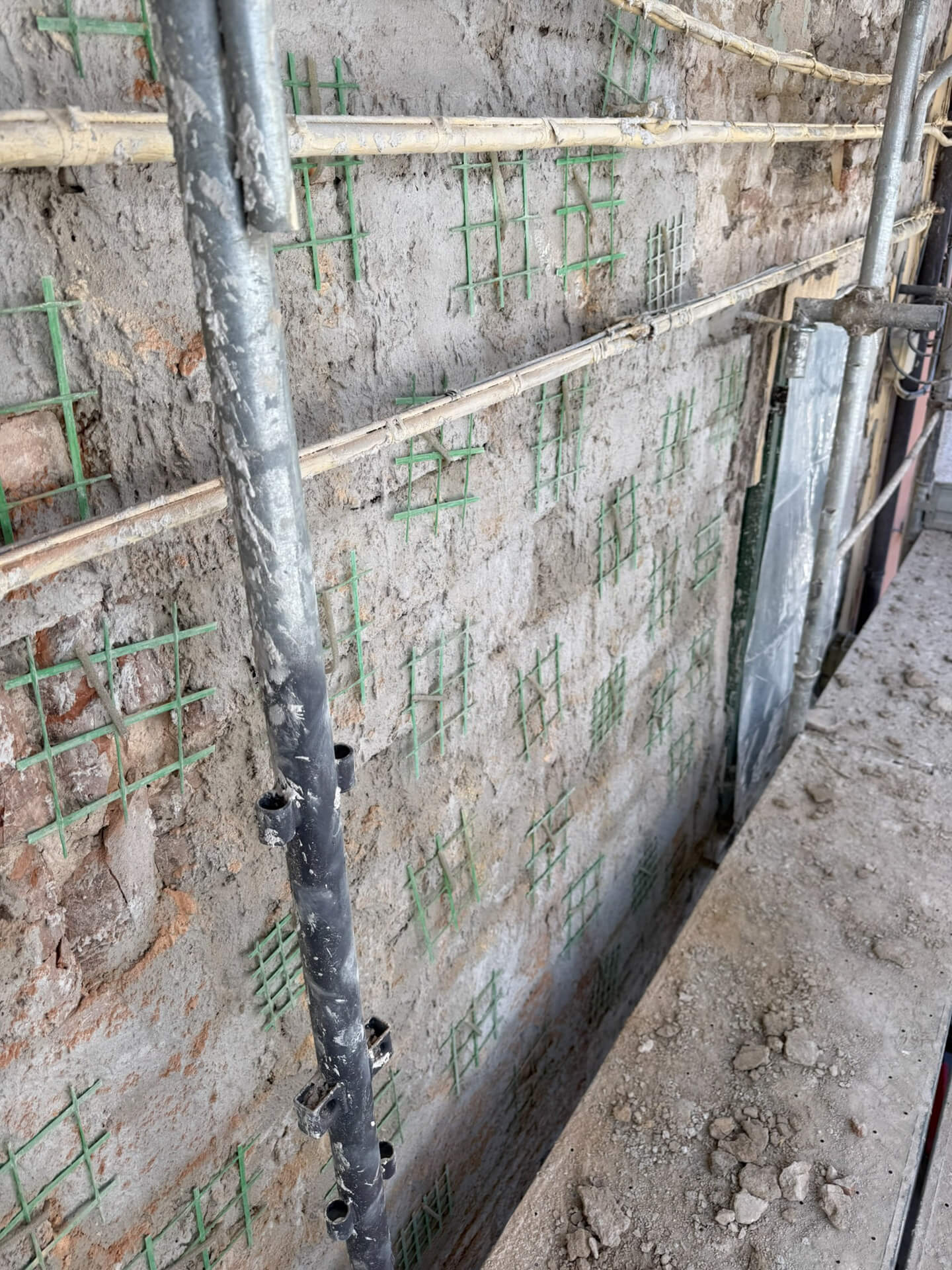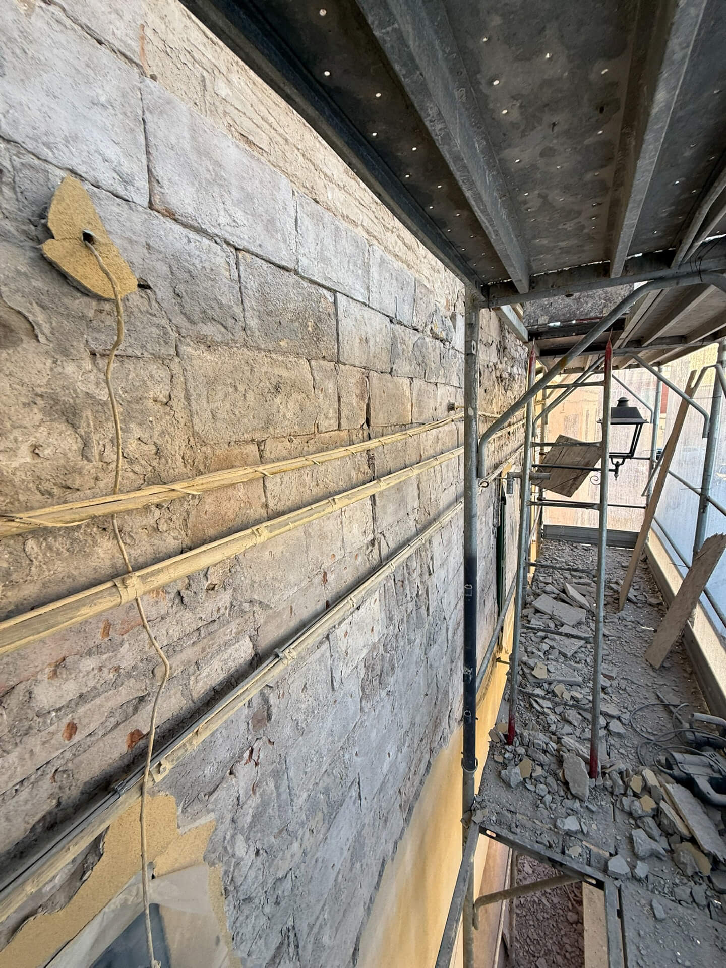 Rifacimento delle facciate esterne mediante la completa demolizione degli intonaci esterni , dell’esecuzione di cuci e scuci , il rafforzamento di porzioni di murature mediante sistemi di bloccaggio fibre di vetro fissate con resine epossidiche e rifacimento mediante intonaci premiscelati idrofugati e finiture ad intonachino colorato .