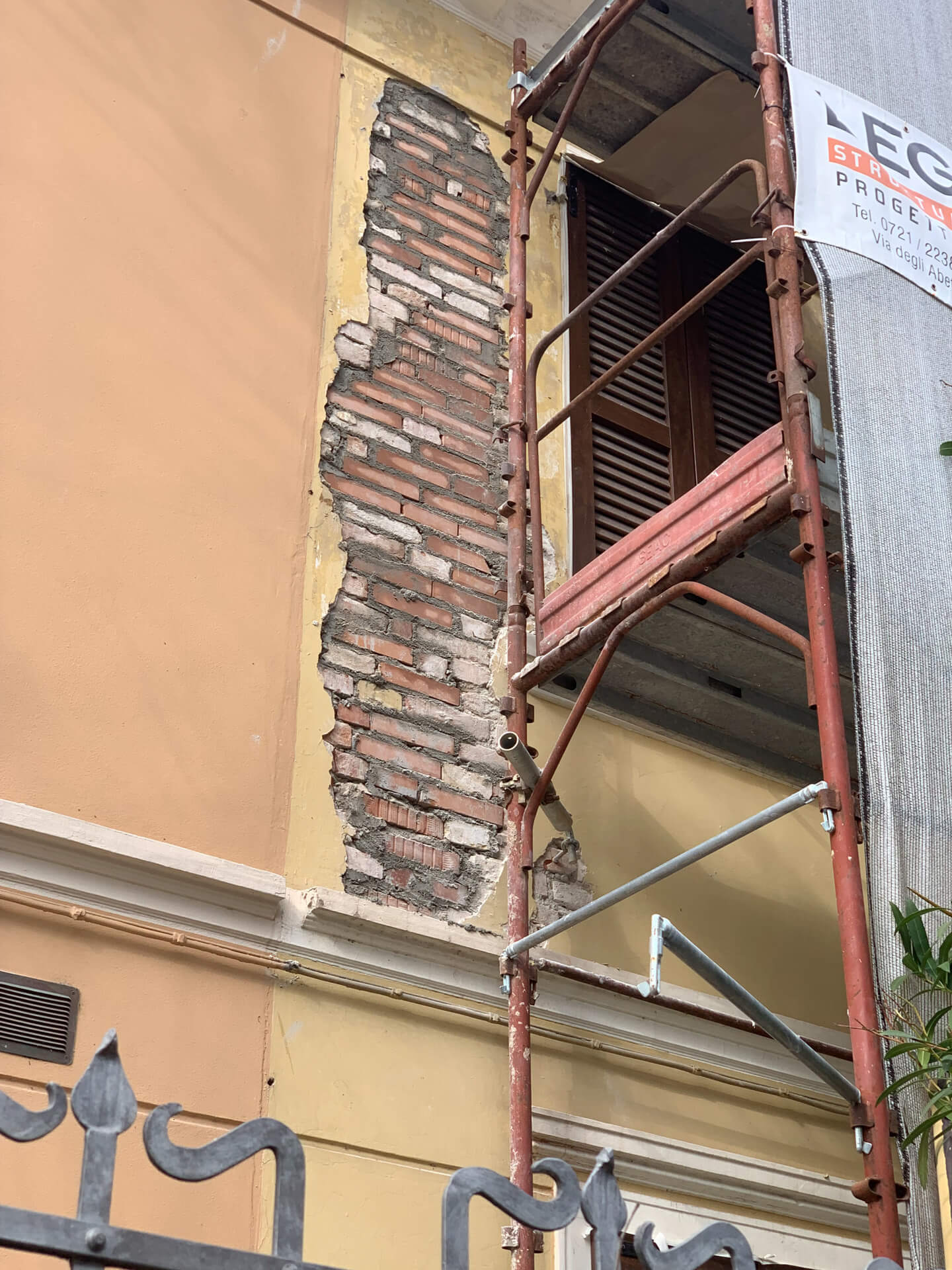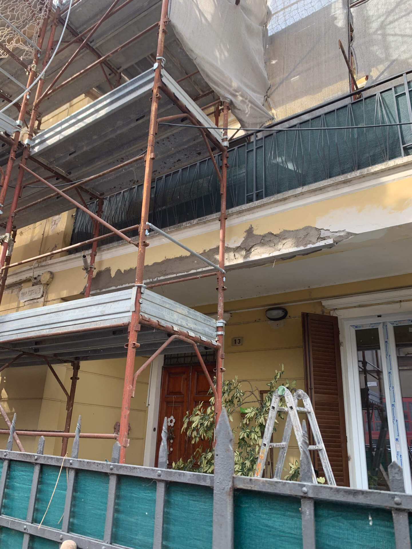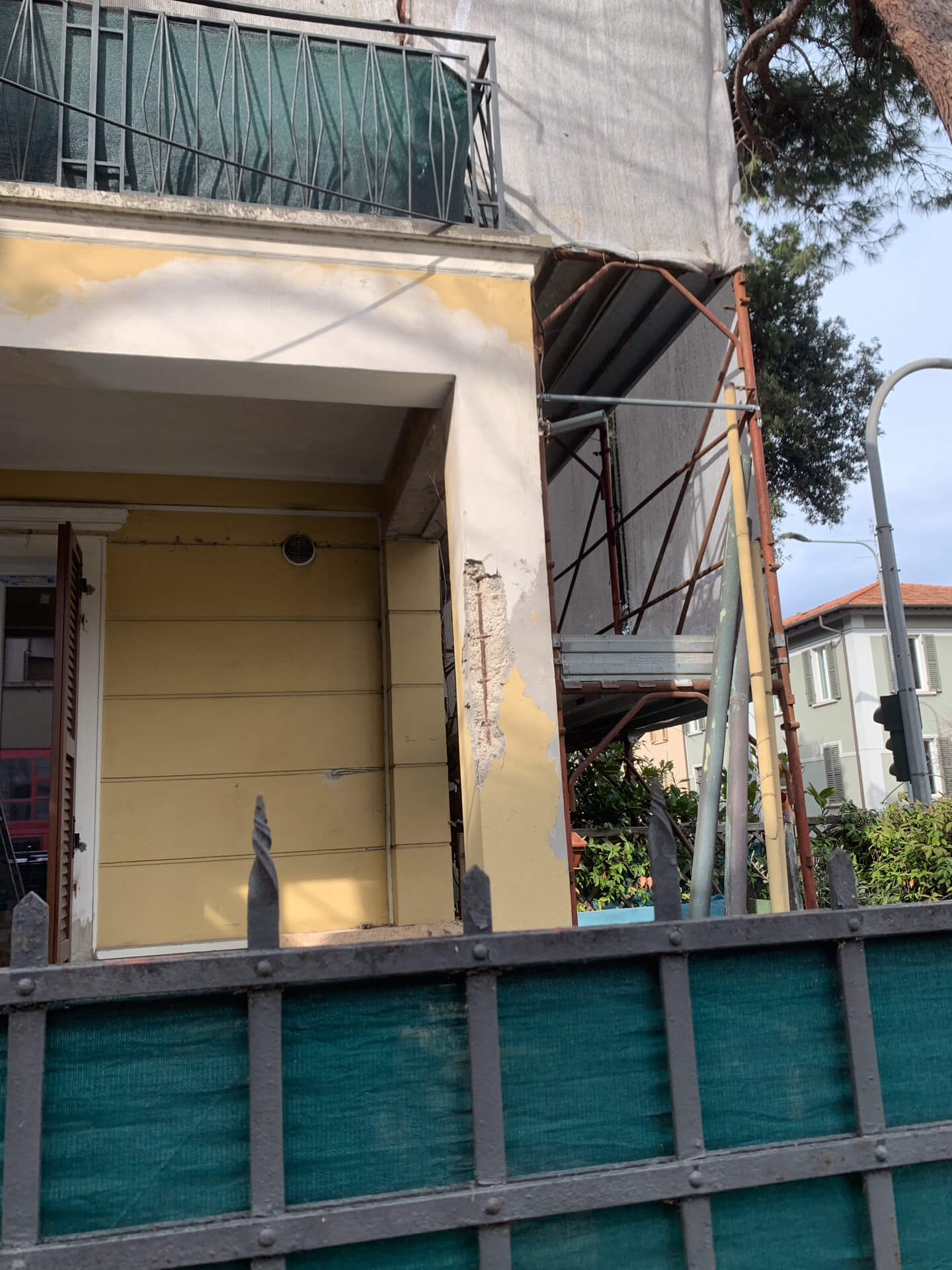 Rifacimento facciata mediante ripristino di intonaci ammalorati , risanamento di porzioni in cemento armato , ciclo di sverniciatura e lavaggio e esecuzione di finitura con intonachino colorato il tutto con ponteggi di nostra proprietà